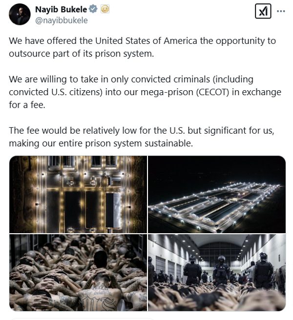 Bukele tweeted out his offer to imprison US citizens in return for cash: